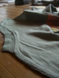 - 襟ぐりが、よれよれになったパパのTシャツから、子供のカバーオールを作りました。ミリタリーカラーに、ロックなプリント柄。