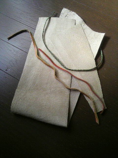 アイテムに合わせて、一枚布を裁断し、周りを自然な感じに整える。デザインを考えて、クリップなどで軽くプレス。ミシンで、慎重に縫う。紐を付けて、出来上がりです。
