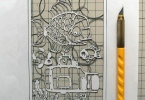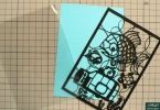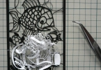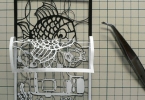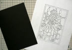 ボク的には明るい色のシルエットが好きなので、もっぱらクリーム色の紙を使っていますけれど「やっぱり切り絵は黒よね」と思う方も多いと思います。でも切り抜く紙の裏側に直接下絵をプリントする方法は黒い紙だと使えません。本格的な切り絵は、下絵を描いた紙をふのりで貼り付け、切り抜いてからぺりっと剥がすのですけれど、小さい切り絵ならペーパーセメントで代用出来ます。