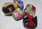 今まで子どもが使っていたお手玉は両端を絞る形だったので、どうしても中身が隙間から出てきていました。そこで、しっかりした作りのものを縮緬の端布を使って作ってみました。