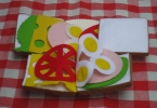 フェルトで出来たサンドイッチのじのない絵本です。 一人目が小さいときに作ったものをお手本に、もう一度作リなおした、食育絵本です。 二人目も好きらしく作っている途中で何度も具材が紛失しました。 何度も作って、もぐもぐ食べるまねをします。 型紙2に、アボカド・シュリンプを追加しました。 型紙3に、ベーコンとサーモンを追加しました。