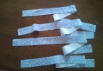 ふつうの布を使うときは60cm×3cmを4枚で作って下さい。 30cm×35cmのクロスを使うときは30cm×3cmを8枚とって、2枚1パーツで使って下さい。布同志を接ぐ必要はありません。 子供用は、2.5cm幅で作ると良いです(写真手前) その時は、長さは気持ち短めにすると、パーツをまとめやすいです。