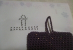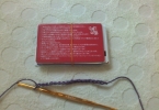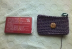 増減無しでぐるぐるこま編み。ポイントカードの高さまで編めたら目を一旦休ませて中心にボタンをつけます。