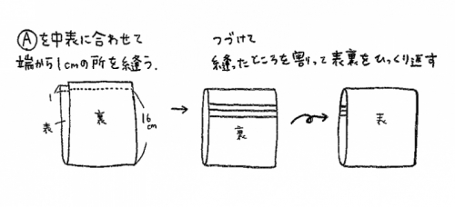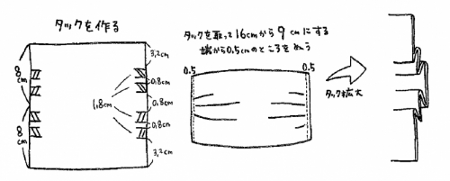 3 タックを作ります。上記場所にタックを入れ、16㎝から9㎝になるように折りタックを押さえるように端から0.5㎝のところをミシンで縫います。※この時にできるだけ0.5㎝以内のところを縫うように気をつけてください。