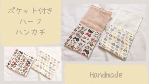 ポケット付きのハーフハンカチの作り方の紹介です。 材料は生地だけでOK! みなさんもぜひ作ってみてください(^^)