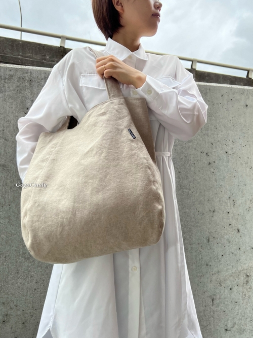 斜めに入るカットラインがちょっと素敵なトートバッグ。いなりもちみたいな形なのでズバリ【いなりもち】というネーミングのバッグです(^^) A4ファイルがしっかり入るサイズの【いなりもちA4】と、A3の大きな図面や書類がそのまま入る【いなりもちA3】の2サイズです。作り方はどちらも同じです。