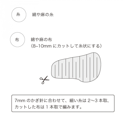 余り糸で編むドリンクホルダーです。作品を作って残った糸や、包装のひもやリボンを使ったり、端切れや古着を細く切ってテープ状にしたり、いろんなアイデアで編んでみてくださいね。サイズは、使いたいドリンクボトルに合わせて作りましょう。 個性的なドリンクホルダーを作って、海へ山へ街へお出かけしましょう。夏休みの宿題にもいいかもですね。 デザイン/梶成子(アトリエseeds)パフェプロジェクト大阪 ジャンボかぎ針「アミュレ」<7mm>https://clover.co.jp/products/42417