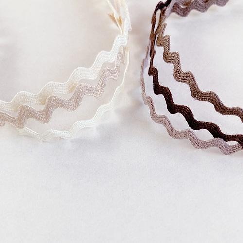 リックラックリボンを重ねて通し、結び終わったら扇を開くように広げると可愛く仕上がります。結び目が緩みそうでしたら、接着剤を使っても、コマ結びしても構いません。
