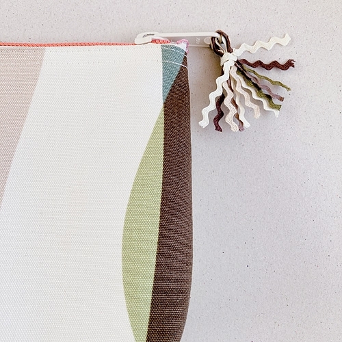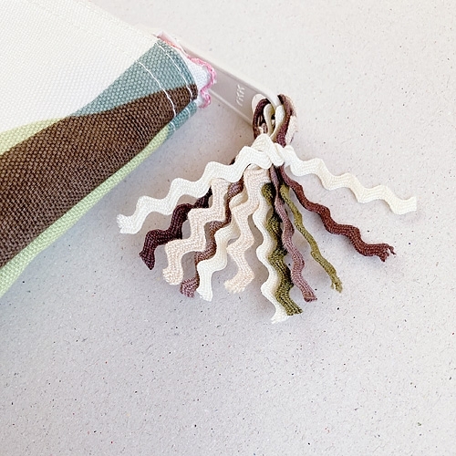 ジグザグ模様が可愛いリックラックリボン(山道リボン)を使って、ファスナーに通して結ぶだけで出来るタッセルを作ってみました。