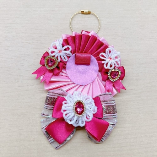 推し活グッズに。缶バッチをつけて楽しめるロゼットです。花とリボンを組み合わせた華やかなデザインです。直径約57mmの缶バッチに対応しています。取り付ける際は中央のリボンと磁石で固定してください。 制作の工程は多いですが、ロゼットメーカーや花あみルームなどの手芸用品を使用することで、難しい作業も簡単にできますよ。 目立つロゼットを作りたい方にぜひチャレンジしていただきたい作品です。