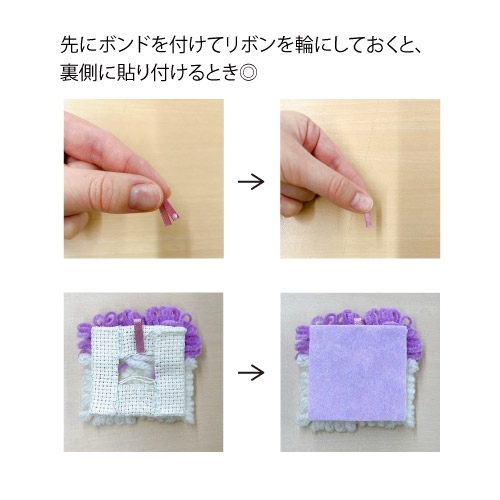 3 3mm幅リボンを半分に折り、裏側に貼ります。貼り付けるときにボールチェーンが通せるように少し外側に出して貼ります。4.5cm角のフェルトを裏側に貼り付けます。(出来上がりの作品に合わせてフェルトの形は調整してください。)