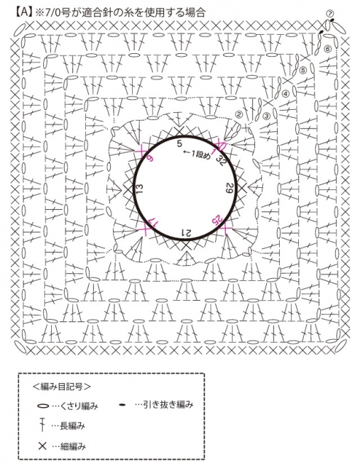 2段めは、長編み3目の模様(辺の模様 5・13・21・29目め)を4つと、四隅(1・9・17・25目め)を作ります。