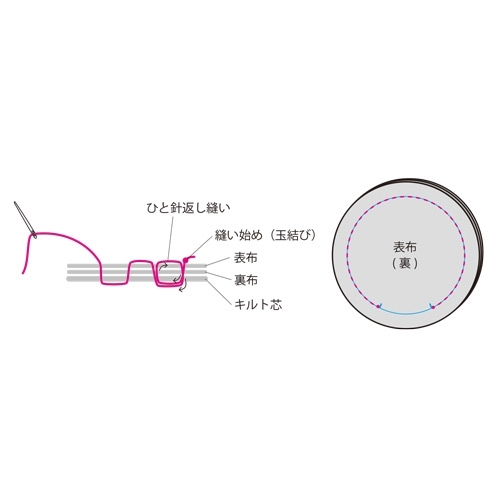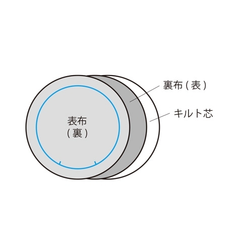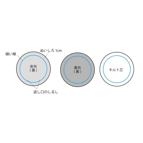 1 表布と裏布を1枚ずつ用意します。実物大型紙(PDFをご覧ください)を使って生地に縫い線を描き、さらに方眼定規を使ってぬいしろ1cmの線を描きカットします。表布には返し口のしるしも描きます。キルト芯にも同じように縫い線を描き、ぬいしろ1cmを付けてカットします。