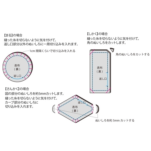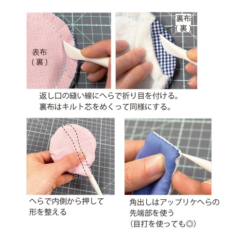 5 返し口から表に返します。表に返す前に返し口の縫い線をへらでしっかりなぞって折り目を付けておくと、表に返したときに返し口のぬいしろをきれいに折ることができます。表に返したら返し口からアップリケへらを差し込み、カーブ部分や角を内側から押して形を整えます。角の部分は内側から押した後、外側からアップリケへらの先端を使って形を整えます。返し口をコの字とじで縫い合わせます。