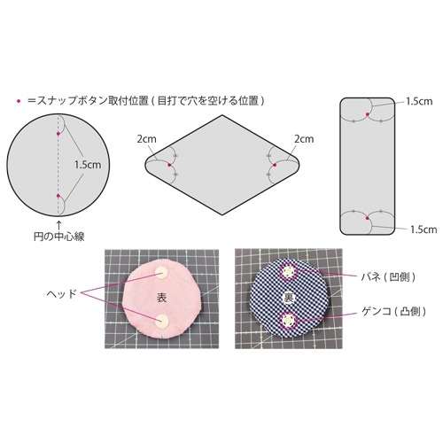 6 スナップボタンを付けます。それぞれ図の位置にしるしを付けて表側から目打で穴を空け、「らくらく取付!薄型プラスナップ13mm」を取り付けて完成です。※「らくらく取付!薄型プラスナップ13mm」の取り付け方は商品台紙中面の説明をご覧ください。