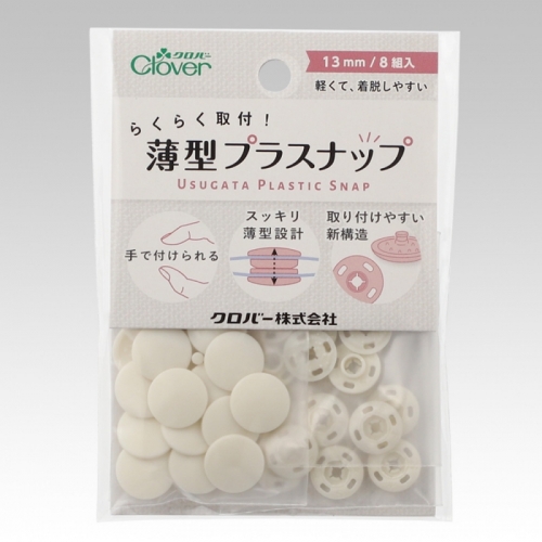 らくらく取付!薄型プラスナップ13mm は、使いやすい10色を揃っています。 器具を使わず取り付けられるプラスチック製のスナップです。 小物のボタン部分などにご活用ください。