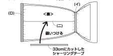 <Aタイプ>のアームカバーの作り方と同様に作りますが、(イ)・(ロ)の部分にシャーリングテープを縫い付けた後、(二)の部分に33cmカットしたシャーリングテープを縫い付けます。その他の作り方は<Aタイプ>のアームカバーと同様です。