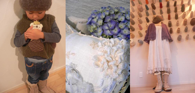 ![]() (左)「愛情を込めて作った作品は、息子もとっても大切にしてくれています」 (中)アジサイをイメージしたリングピロー。小さなモチーフの中心にスワロフスキービーズを。 (右)編むのも着るのも両方楽しめるのがニットの醍醐味。「ベレー帽、ショール、ワンピースの縁編み、すべて手編みです」 |