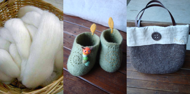 ![]() (左)染色ナシの羊の毛。「メリノとういう品種の羊です。このあたたかさが、たまりませんね」 (中)ベビーシューズ。「本体はごしごしこすって作り、“にっこり顔”のあおむしは専用針でプスプスして作りました。羊毛のシュ ーズは本当にあったかくて、冬は手放せません」 (右)横幅38cm、縦30cm、まちもついた大きめのバッグ。「リネンの内袋をつけました。荷物もたっぷり入るので便利です」 |