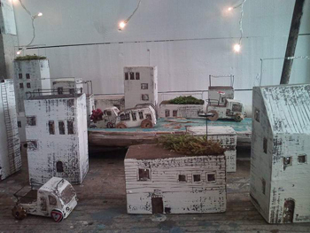 屋根の上のボタンはパラソル、ビーズはライト。「初めての個展で