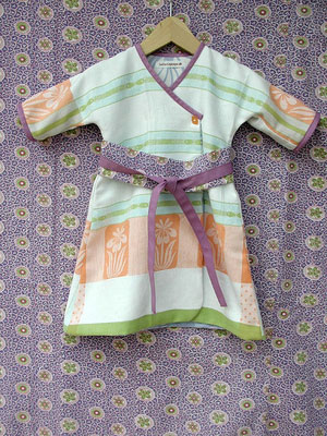 地元のチャリティーショップで素晴らしい柄のヴィンテージの布を使ったベッドシーツが、売られているのを見つけたのですが、それは棚の奥で埃をかぶっていて、見向きもされていませんでした。すぐにその魅力に取り付かれ、私が生き返らせることにしたのです。1960年代~70年代の特徴的な柄と印象的な色は、子供服にぴったりだと思っています。