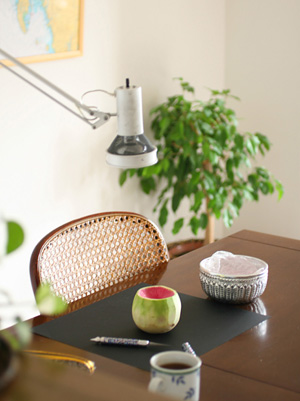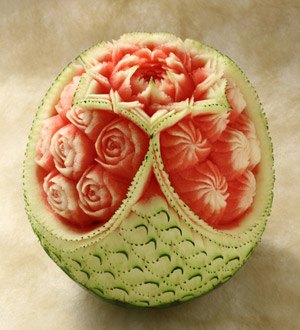 フルーツの場合は、半分ぐらいまでは事前に考えてあったイメージで彫っていき、あとはそのときの素材の状態にあわせて変えることが多いです。例えば、スイカを彫りはじめたときに、皮の緑から白、赤へのグラデーションに色気を感じたら、その色気を生かすようにデザインを変えていきます。フルーツはとにかく色っぽくあってほしいと思っています。