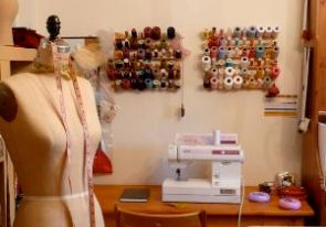 ![]() ![]() (左)ミシンをかけるスペース。糸は明暗で色分け。マネキンは学生の時から使用しているもの。 (右)いっぱい同じ物を作るのは飽きるけど、舞台で一度に見るとやっぱり嬉しい。 |