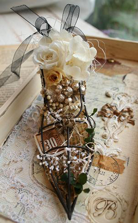 一度ペンダントトップの講習会を企画した時、講師として来ていただいたのですが、ディスプレイ用にレースなどを組み合わせた物を作ってみたら、ますます興味がわきました。彼女は自宅に工房をもっていて教室も開いているので、いつか通ってみたいと思っています。
