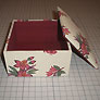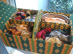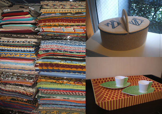 ![]() 左は材料の布がびっしり入った布棚(これでも一部)。ここから、右の箱やトレイのような美しい作品が生まれる。 |