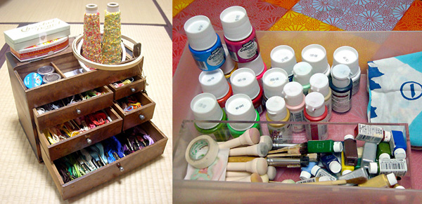 (左)和裁をやっていたおばあさまからもらったという道具箱には、刺繍糸などをストック。