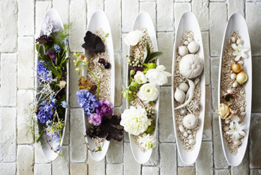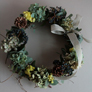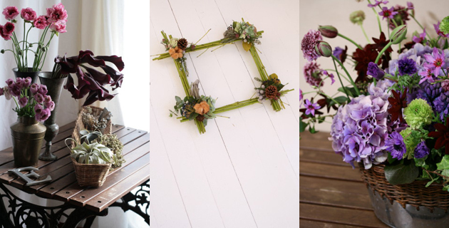 (左)この日は“シャルロット”という珍しいラナンキュラス、“ホットチョコレート” というシックなカラーが入荷。「季節ごとにいつも 新鮮な花を使っています」 (中)木の実やドライフラワーをあしらったスクエア・リース。「アトリエ・レッスンでは、生花のアレンジだけでなく、こんなリースも 制作できます」 (右)シックなパープル&グリーンで制作したアレンジ。ブリキの器はフランスで仕入れてきたもの。 |