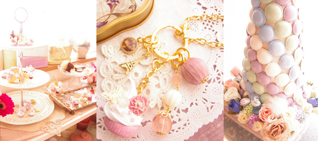 ![]() (左)お気に入りの食器や雑貨を飾っている棚に作品をディスプレイ。「本物のように飾ることで雰囲気も出ると思います」 (中)ピンク色のカップケーキをメインにしたバッグチャーム。「カメオや大人っぽいチャームを組み合わせました」 (右)高さ約50cmのかなり大きめのマカロンタワー。「淡いブルーベースで流れるような配色にしました。下部にはバラなどのお 花で着飾り、ゼリーやマカロンなども飾って賑やかなイメージにしました」 |