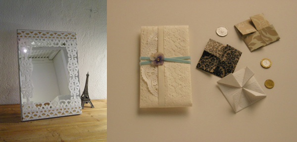 ![]() (左)「洋」モチーフの切り紙をあしらった鏡。 (右)折り紙で作ったご祝儀袋とぽち袋。 |