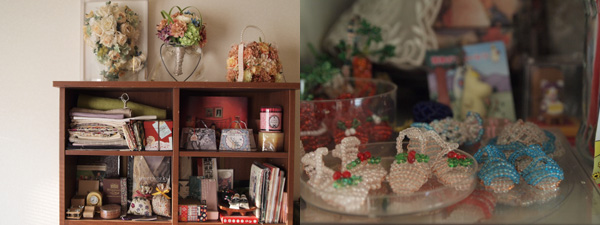![]() (左)アトリエには素材や作品をアトランダムにディスプレイ。日々眺めることで制作のヒントを得るそう。 (右)好きなものたちを集めたコーナーも。ビーズの靴は正久さんが小さい頃、お母様が作ってくれたものだとか。 |