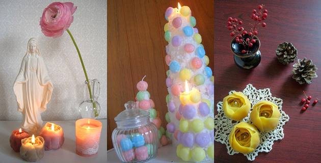![]() (左)ピンクのラナンキュラスとマリア像。「キャンドルと一緒にシンプルに飾っています」 (中)パステルカラーのマカロンタワー。「大きいキャンドルは迫力がありますね」 (右)蜜ロウで作ったバラのキャンドル。「みつばちの状態によって蜜ロウの色が変わるそうです」 |