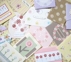 ![]() ![]() ![]() (左)作業机に座ってカードのデザインを考え始めると、時間の経つのを忘れることも…。 (中)「お花のカードを作るのが大好きです」 (右)「カード作りに夢中になる前は、娘たちの洋服作りに夢中でした。今では紙にミシンをけていることのほうが多いですね」 |