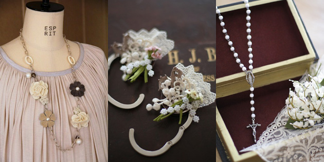 ![]() (左)制作したアクセサリーをトルソーにディスプレイ。「インテリアを楽しんだり、ネットショップ用の撮影にも使用しています」 (中)テーブルに、バッグを下げる時に使うバッグホルダー。レースや布花をたっぷり使ってプチゴージャスに仕上げた作品。 (右)キリスト教で祈りの儀式に使用するロザリオ風のネックレス。使用しない時は部屋のディスプレイとしても楽しめる。 |