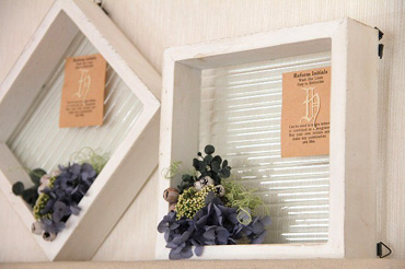 ダメージ風に仕上げた額縁にドライフラワーやブリザーブドフラワー、木の
