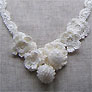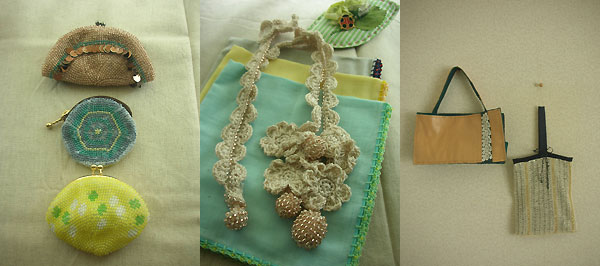 素朴でナチュラルな手芸テイスト&おしゃれなアクセサリーテイストをほどよくミックスさせたいと思っています。例えば、ガーゼのハンカチにはビーズ編みをあしらって、懐かしさのなかにおしゃれさをプラスしたり、花や果実のモチーフがついたネックレスは、ビーズを編みこむことによりネックレスに重みが出て、体に寄り添うようにつくっています。自分で言うのもなんですが、かわいいたくらみだと思いません!?