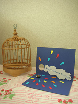 ビーズのくるみボタン縫いとめたカード。