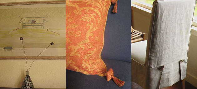 ![]() (左)スコットランドの家のインテリア。「ソファを描いたものは友人のアートで、私の大切な宝ものです」 (中)オリエンタルをテーマにしましたクッション。ランタンをイメージしたタッセルを装着。 (右)学生時代カレッジで試験課題として制作したチェアーカバー。「高い評価をいただいた思い出の作品で今でも大好きです」 |
