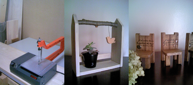 ![]() (左)細かい木工に欠かせない糸ノコ。「2畳ほどのスペースにブルーシートを敷いて、アトリエというより作業場という言葉が似 合う感じのところで、制作をしています(笑)」 (中)グリーンの小さな飾り棚。持ち手部分は公園で拾った木。いつでも日当たりのいい所に運べるので便利。 (右)割りピンのイス。「普通はラッピングや手紙など紙のものに使われる割りピンですが、穴をあけて差し込めるので木工に使 ってみました」 |