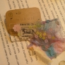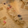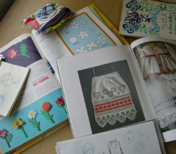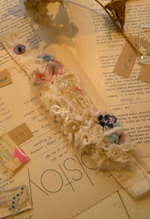 ![]() ![]() ![]() (左)「民族衣装の資料や海外の手芸本を見てアイデアを考えます」いつも持ち歩いている落書きノートには手描きのイラストも。 (中)初めて行った個展(4月)のディスプレイ。散らかった部屋をコンセプトに作品を展示。 (右)布、レース、スパングル、樹脂を盛り込んだブレスレット。 |