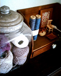 毛糸玉やリネン糸をディスプレイにも使ってます。