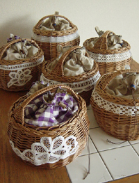 ![]() ![]() ![]() (左)引き出しの中には骨董市で購入したレースなどたくさん。 (中)一年中持てるリメイクカゴbag。市販のカゴにアンティークレースやバテンレースをあしらって。 (右)たっぷり入るグラニーbag。持ち手とクロスのアップリケは本革でアクセントを。 |