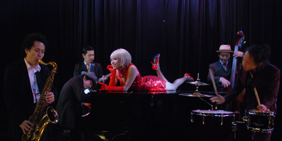 マリリン・モンロー主演の「お熱いのがお好き」で、マリリンがピアノの上に乗って歌っているシーンがあるんですが、そのとき着ているスパンコールのドレスをヒントに作った衣装が、今回のカバーアルバムのジャケットにもなっています。それから、「キャバレー」のライザ・ミネリが踊り子と一緒に踊っているシーンで着ているちょっとセクシーな衣装や、踊り子が着ている水兵モチーフの衣装も作りました。水兵モチーフものは、アンナ・カリーナが「女は女である」の中で着ているものも好きで、今回新しく作ったんですよ。