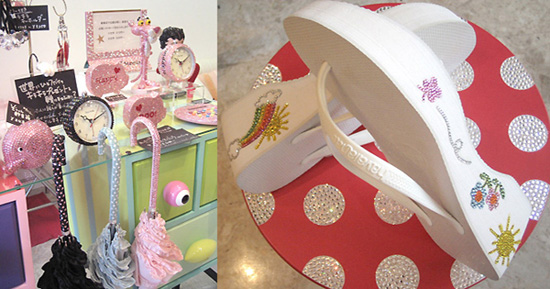![]() (左)傘や貯金箱も、ちょっとキラキラを施すだけで、ゴージャスに。 (右)夏に人気の厚底ビーチサンダルも、キラキラデザインでオリジナル度アップ! |