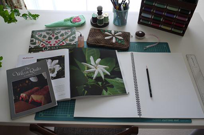 仕事机にはキルトのストーリーが載っている洋書やハワイで買ってきた植物の本。