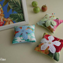 ![]() (左)仕事場のコーナーにはいつもお気に入りのキルトをディスプレイ。スタンドフープはここが定位置、本箱にはよく使う本だけ を収納。 (中)お気に入りのプルメリアのショルダー。「色合いがシックなので洋服を選ばず、これからの季節に活躍しそうです」 (右)ウル(ぱんの木)のクッション。ハワイアンキルトをはじめる時に必ず作るのがウルのモチーフ。成長、繁栄などの意味がある のでファーストキルトに。 |