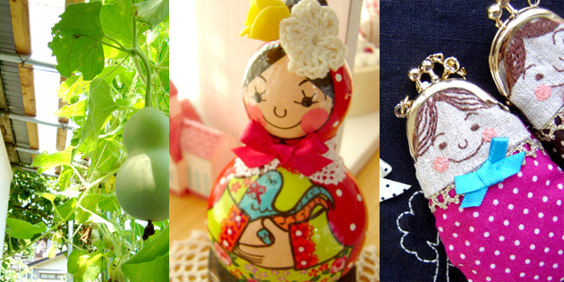 ![]() (左)アトリエの外の屋根を植物のカーテンで覆うように、ひょうたんを軒下でも栽培。 (中)手編みした花を髪に飾った『ひょうたんガール』。作品はアトリエ内にインテリアとしていつもディスプレイ。 (右)小さなガマグチは『ひょうたんガール』をイメージして作ったもの。背景の黒のおうちの刺しゅうはブックカバー。「リボンやレ ースを縫いつけることが好きです」 |
